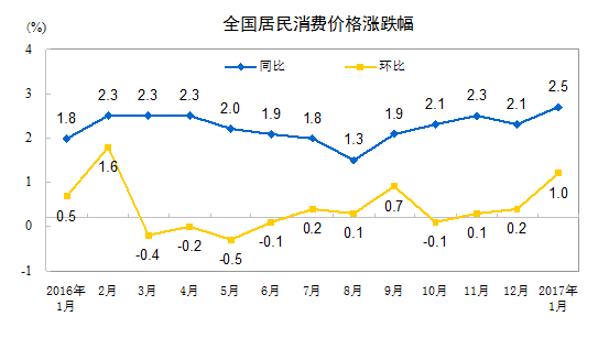 2017年1月份,全國居民消費價格總水平同比上漲2.5%。其中,城市上漲2.6%,農(nóng)村上漲2.2%;食品價格上漲2.7%,非食品價格上漲2.5%;消費品價格上漲2.2%,服務價格上漲3.2%。
