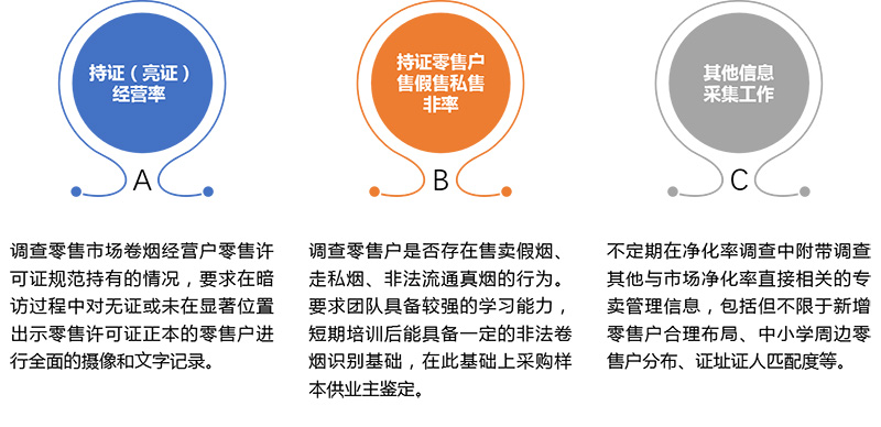 華夏經(jīng)緯根據(jù)區(qū)域經(jīng)濟(jì)、客戶分布、業(yè)態(tài)布局、卷煙銷量等因素,結(jié)合各地?zé)煵菔袌龅奶攸c(diǎn),因地制宜為監(jiān)測區(qū)域構(gòu)建獨(dú)立的市場凈化率抽樣模型,科學(xué)、全面體現(xiàn)當(dāng)?shù)責(zé)煵菔袌鰞艋?。市場凈化率調(diào)查的主要內(nèi)容包括(不限于)持證(亮證)經(jīng)營率和持證零售戶售假售私售非率等信息。
