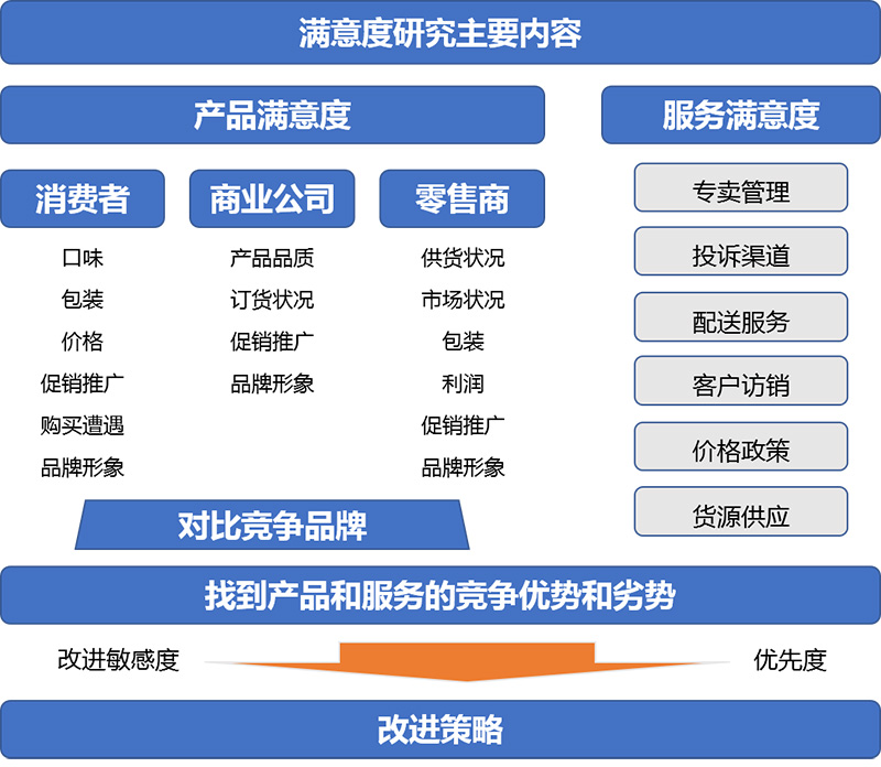 煙草的滿意度研究主要包括產(chǎn)品滿意度和服務(wù)滿意度兩個方面。產(chǎn)品滿意度考評主要來自于流通的各個環(huán)節(jié)對卷煙品牌的滿意狀況,而服務(wù)滿意度則主要是零售終端對煙草公司服務(wù)狀況的滿意程度。