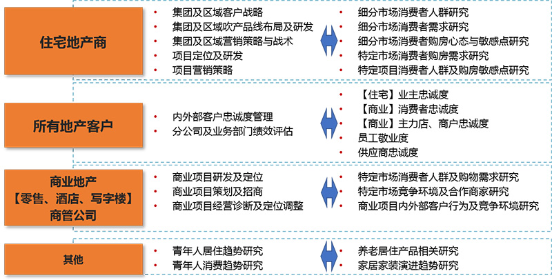 針對(duì)地產(chǎn)企業(yè)的不同業(yè)務(wù)部門/模塊,華夏經(jīng)緯提供多樣化、全覆蓋的市場(chǎng)研究服務(wù),全面助力專項(xiàng)業(yè)務(wù)能力提升。