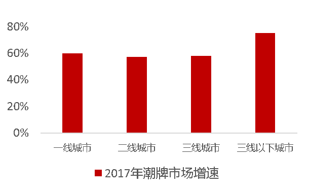 (2)從潮牌服裝市場消費城市規(guī)模來看,消費一二線城市引領(lǐng)消費,三線以下城市增速強(qiáng)勁。一二線城市消費基礎(chǔ)好,潮牌消費額處于全國領(lǐng)先的高度,增速相對穩(wěn)定。而對于三線及以下城市雖然消費額較低,但增幅卻高于一線城市。