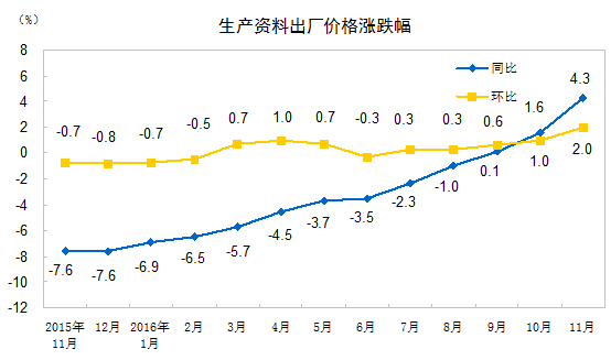 2016年11月份工業(yè)生產(chǎn)者出廠價格同比上漲3.3%